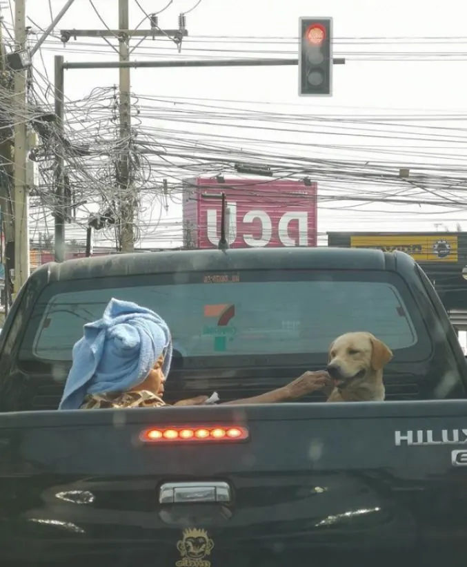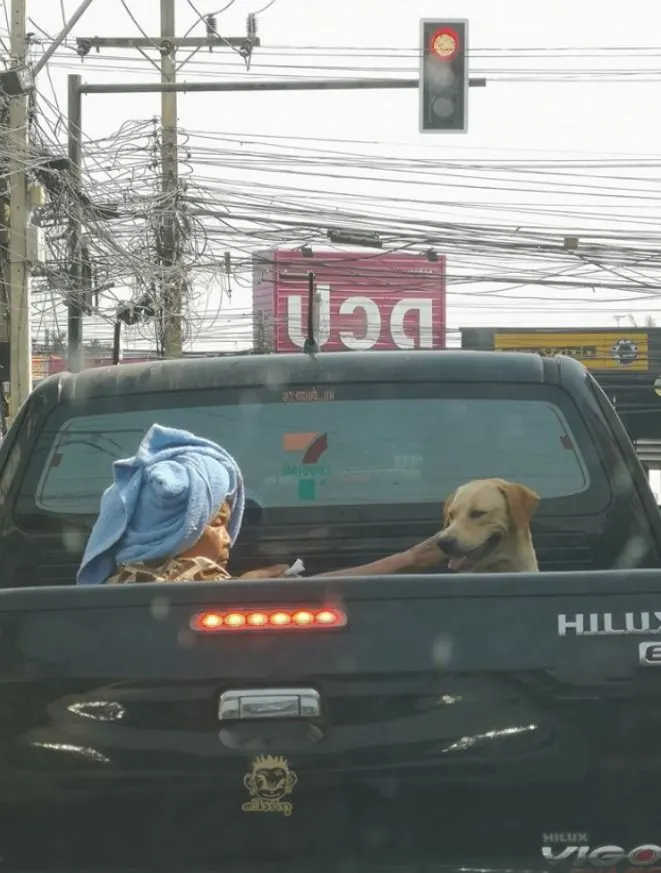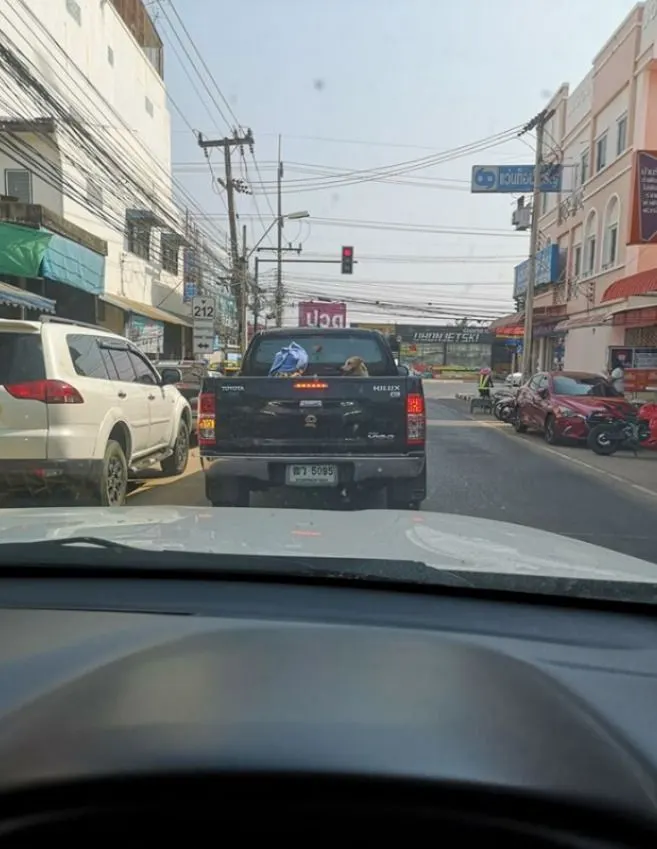 สาวเห็นยๅยนั่งหลังกระบะ กับสุนัข ซูมดูชัดๆเป็นอย่างที่คิด