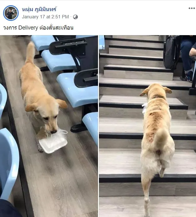 โดยทางผู้ใช้เฟซบุ๊ค หนุ่ม ภูมิมินทร์ ได้เผยภาพสุดน่ารักของ เจ้าตูบตัวหนึ่ง ที่เดินคาบถุงบรรจุกล่องโฟมใส่อาหาร คาดกันว่าน่าจะเป็นเมนูข้าวมันไก่ พร้อมข้อความ วงการ Delivery ต้องสั่นสะเทือน