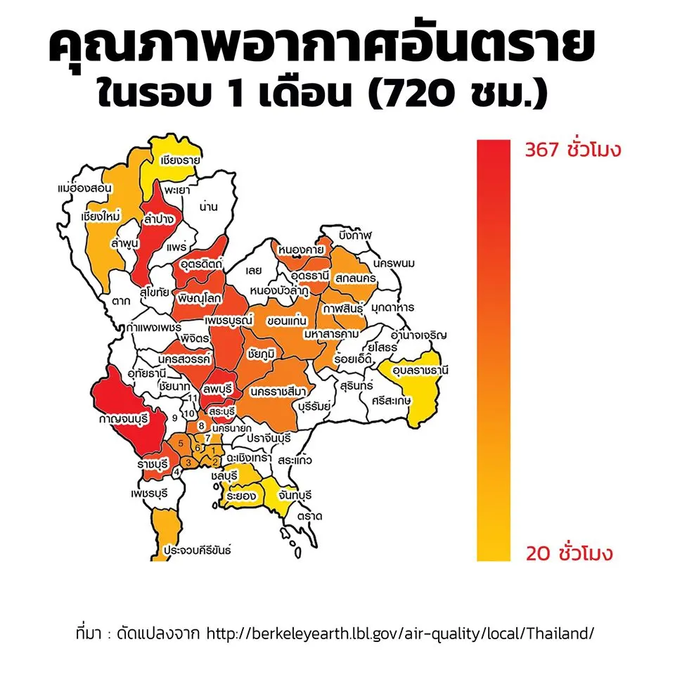 2. คุณภาพอากาศระดับเลวร้ายจนส่งผลกระทบต่อสุขภาพไม่ได้เกิดขึ้นเฉพาะกรุงเทพเท่านั้น แต่ในหลายจังหวัด ซึ่งอยู่ในพื้นที่ปลูกพืชไร่สำคัญและจังหวัดใกล้เคียง เช่น กาญจนบุรี ลพบุรี อุตรดิตถ์ พิษณุโลก นครสวรรค์ สุพรรณบุรี ราชบุรี กำแพงเพชร มีจำนวนชั่วโมงที่คุณภาพอากาศอยู่ในระดับอันตราย (unhealthy) จนถึงอันตรายมากๆ (very unhealthy) ในรอบ 1 เดือนยิ่งกว่ากรุงเทพมหานครเสียอีก
