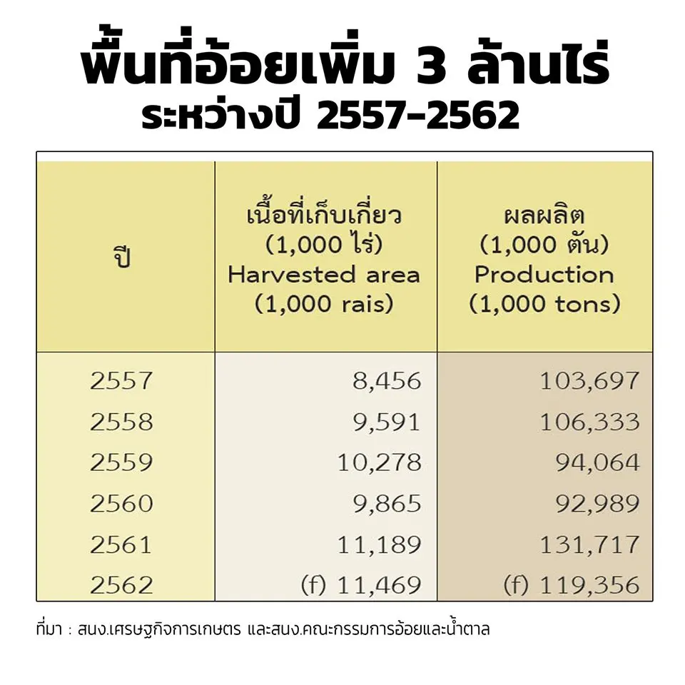 4. จำนวนของฝุ่นควันพิษที่เพิ่มขึ้นนี้อาจเกี่ยวข้องโดยตรงกับการเพิ่มพื้นที่ปลูกอ้อยจาก 8,456,000 ไร่ เป็น 11,469,000 ไร่ หรือเพิ่มขึ้นมากถึง 3,013,000 ล้านไร่ ระหว่างปี 2557-2562 ซึ่งอยู่ในช่วงรัฐบาลคสช. ที่มาพร้อมกับนโบาย "ประชารัฐ"