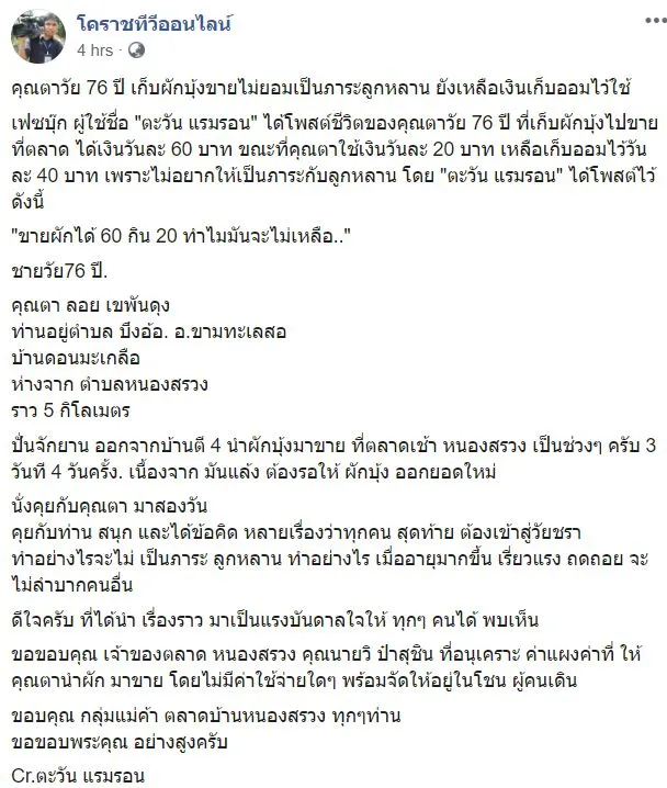 โดยจากผู้ใช้เฟซบุ๊ค ตะวัน แรมรอน ได้โพสต์ชีวิตของคุณตาวัย 76 ปี ที่เก็บผักบุ้งไปขายที่ตลาด ได้เงินวันละ 60 บาท ขณะที่คุณตาใช้เงินวันละ 20 บาท เหลือเก็บออมไว้วันละ 40 บาท เพราะไม่อยากให้เป็นภาระกับลูกหลาน โดย “ตะวัน แรมรอน” ได้โพสต์ไว้ดังนี้