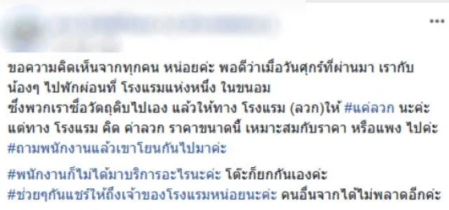 โดยเธอนั้นได้ระบุว่า ขอความคิดเห็นจากทุกคน หน่อยค่ะ พอดีว่าเมื่อวันศุกร์ที่ผ่านมา เรากับน้องๆ ไปพักผ่อนที่ โรงแรมแห่งหนึ่ง ในขนอม ซึ่งพวกเราซื่อวัตถุดิบไปเอง แล้วให้ทาง โรงแรม (ลวก)ให้ แค่ลวก นะค่ะ แต่ทาง โรงแรม คิด ค่าลวก ราคาขนาดนี้ เหมาะสมกับราคา หรือแพง ไปค่ะ ถามพนักงานแล้วเขาโยนกันไปมาค่ะ พนักงานก็ไม่ได้มาบริการอะไรนะค่ะ โต๊ะก็ยกกันเองค่ะ ช่วยๆกันแชร์ให้ถึงเจ้าของโรงแรมหน่อยนะค่ะ คนอื่นจะได้ไม่พลาดอีกค่ะ