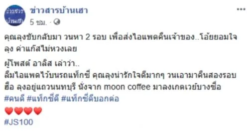 ผู้ใช้เฟซบุ๊ก ข่าวสารบ้านเฮา ได้โพสต์ภาพพร้อมระบุข้อความว่า คุณลุงขับกลับมา วนหา 2 รอบ เพื่อส่งไอแพดคืนเจ้าของ โอ้ยยอมใจลุง ค่าแก๊สไม่ห่วงเลย