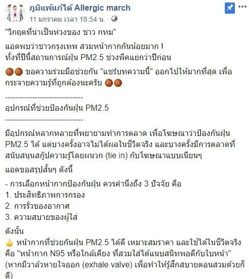 ล่าสุด เฟซบุ๊กเพจ ภูมิแพ้แก้ได้ Allergic March ได้ออกมาให้ความรู้ ในการเลือกหน้ากากอนามัยให้ได้ผลดี สามารถป้องกันฝุ่น PM2.5 ได้ โดยได้ระบุว่า