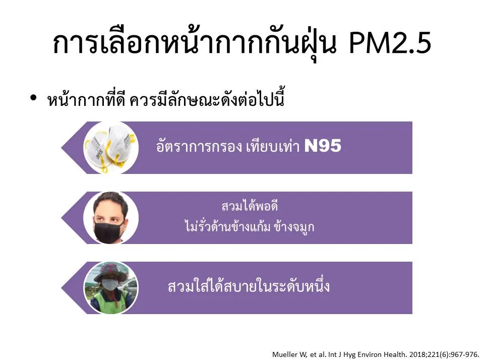 หน้ากากที่ช่วยกันฝุ่น PM2.5 ได้ดี เหมาะสมราคา และใช้ได้ในชีวิตจริง คือ "หน้ากาก N95 หรือใกล้เคียง ที่สวมใส่ได้แนบสนิทพอดีกับใบหน้า" (หากมีวาล์วหายใจออก (exhale valve) เพื่อทำให้รู้สึกสบายตอนสวมด้วยก็ดี)