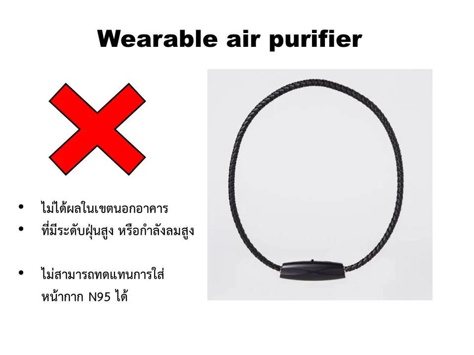 - เครื่องฟอกอากาศแบบพกพา คล้องคอ (wearable air purifier) ที่ใช้วิธีการยิงประจุไปรอบศีรษะ ไม่ได้ผลในชีวิตจริงครับ ข้อมูลมีประโยชน์แค่ในระดับห้องทดลอง และสภาวะที่ความเร็วลมไม่มาก จึงไม่เหมาะสมกับระดับฝุ่นที่สูงอย่างในประเทศไทย และไม่สามารถใช้ทดแทนหน้ากาก N95 ได้