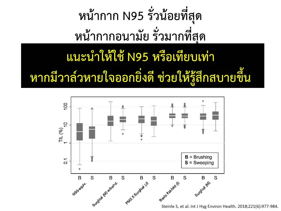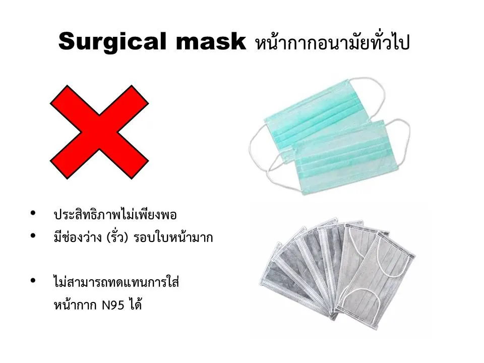อีกทั้งยังมีลมหลุดรั่วเข้ามากระจาย แต่กรณีที่ไม่มี N95 จริง การใส่ก็ดีกว่าไม่ใส่อะไรเลย ทั้งนี้ควรเลี่ยงอยู่นอกอาคารในช่วงที่ฝุ่นมีระดับสูง
