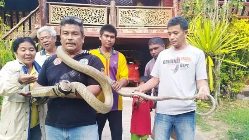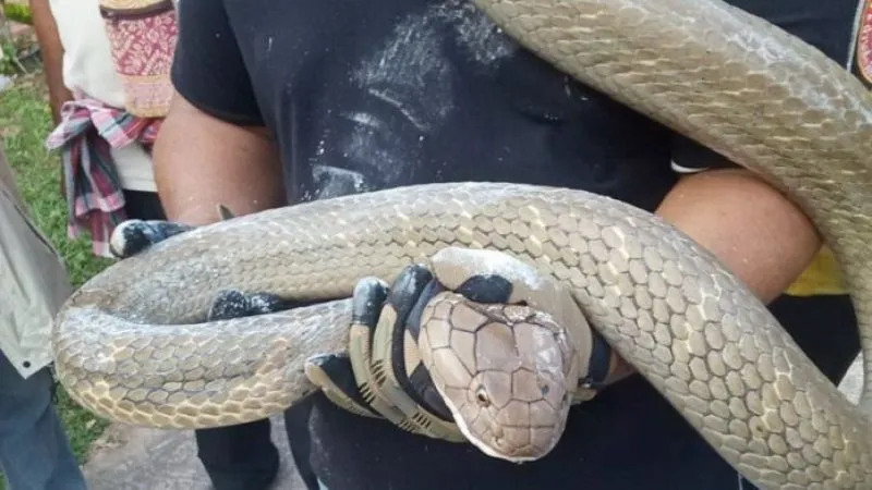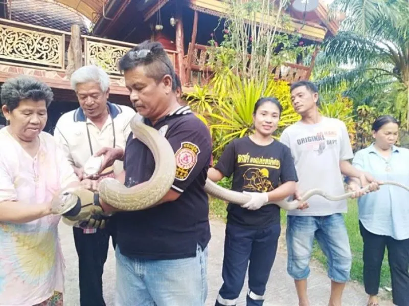 ขณะที่ชาวบ้านนำแป้งมาทาตามลำตัว และปลดตัวเห็บที่กัดตามลำตัวงูจงอางยักษ์ พร้อมภาวนาขอพรต่างๆนาๆ ทั้งขอให้มีโชคลาภ ขอให้อย่าเจ็บไข้ได้ป่วย และขอให้อย่ามาโชว์ตัวให้ลูกหลานได้เห็นอีกต่อไปเลย คาดสาเหตุที่พญาจงอางหรืองูจงอางยักษ์ตัวนี้ เลื้อยมายังบ้านสองตายาย เพราะช่วงนี้สภาพอากาศในป่าเริ่มแห้งแล้ง เนื่องจากฝนหยุดตกติดต่อกันมาหลายวันแล้ว ทำให้งูเลื้อยหนีร้อนลงมาหลบอยู่ตามบ้านเรือนของชาวบ้าน จากนั้นหน่วยกู้ภัยจับใส่กระสอบนำไปปล่อยป่าห่างไกลชุมชน