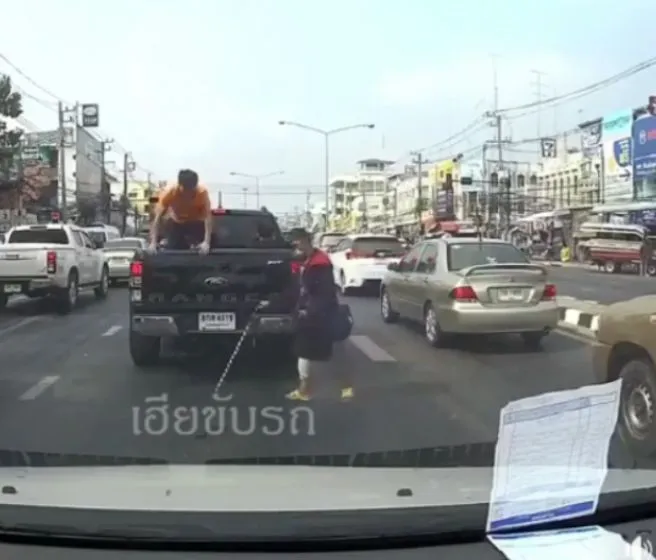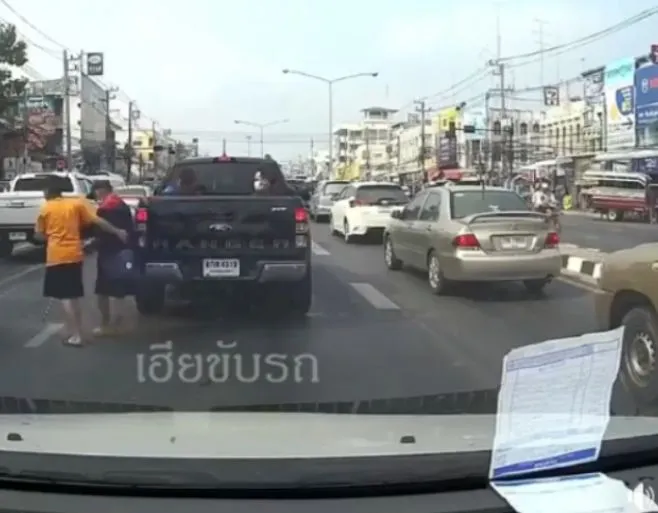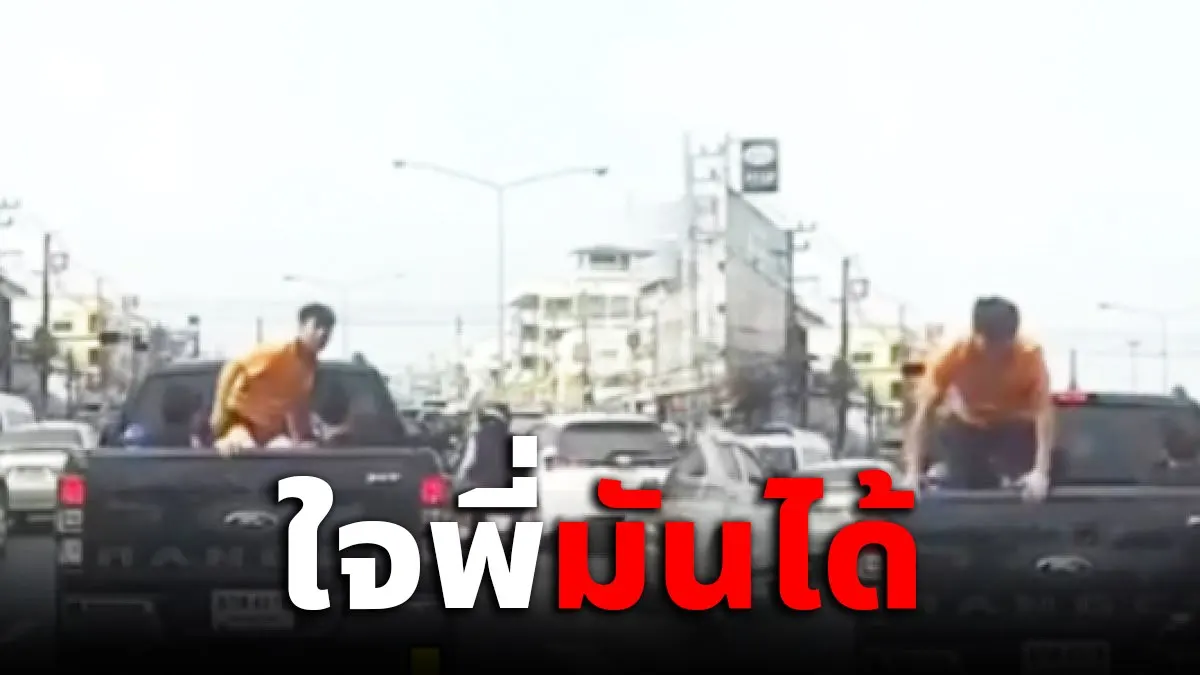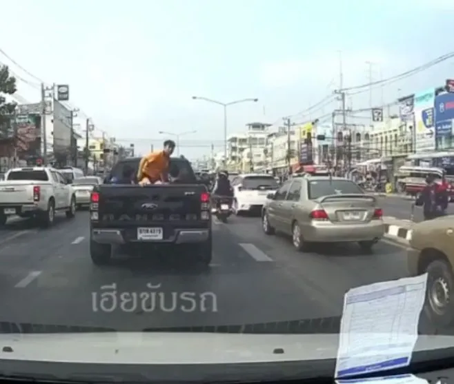 ชายใส่เสื้อเหลืองนั่งหลังกระบะ กระโดดลงจากรถ มันทนไม่ไหว หลังเห็นเต็มสองตา