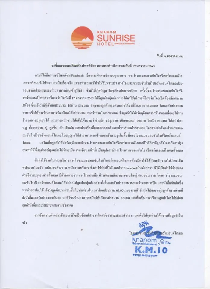 ล่าสุด เพจ ขนอม ซันไรส์ รีสอร์ทเเอนด์โฮเทล – Khanom Sunrise Resort And Hotel โพสต์ข้อความระบุว่า ขอชี้แจงรายละเอียดเรื่องโพสต์บิลอาหารและค่าบริการของวันที่ 17 มกราคม 2563 ที่กำลังเป็นที่วิพากษ์วิจารณ์กันอย่างเเพร่หลายใน Social ตอนนี้ รายละเอียดตามรูปเเนบครับ