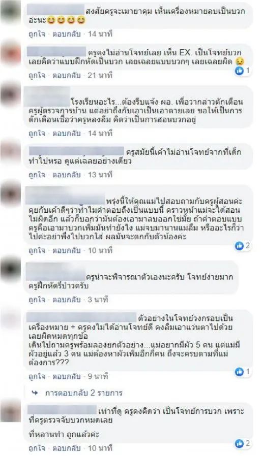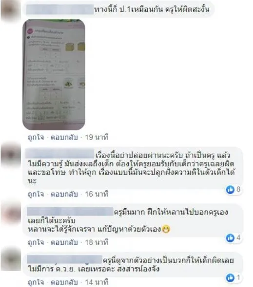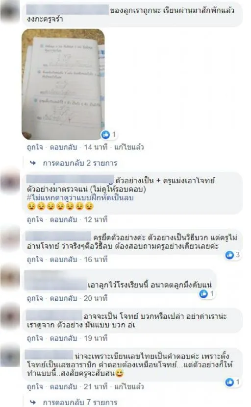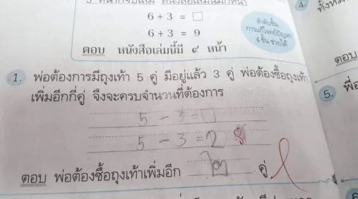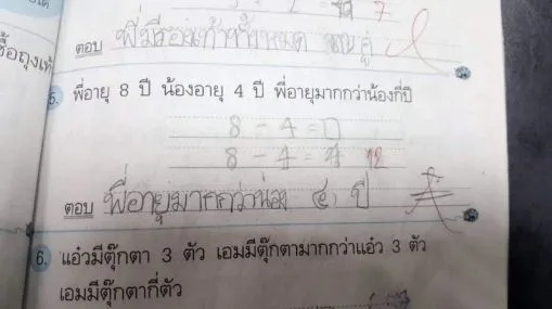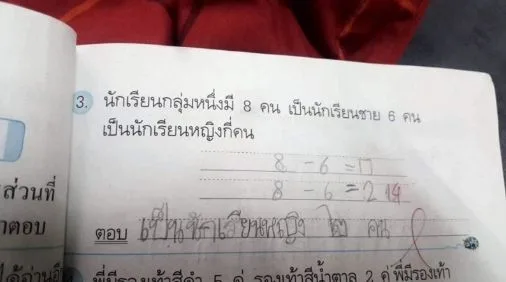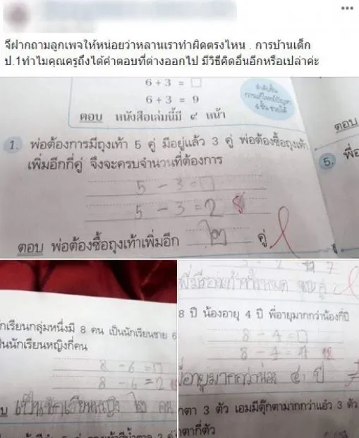 เช่นเดียวกับเรื่องราวดังต่อไปนี้ เป็นเรื่องราวที่สร้างความตกใจและสงสัยให้กับผู้ปกครองเป็นอย่างมาก เมื่อผู้ใช้เฟซบุ๊กรายหนึ่งได้โพสต์ข้อความเผยแพร่เรื่องราว หลังจากที่คุณครูได้ตรวจการบ้านของหลานชาย แต่พออ่านโจทย์ที่ได้รับมาตนมั่นใจว่าคำตอบถูกแล้ว แต่ครูกลับตรวจว่าคำตอบนั้นผิด