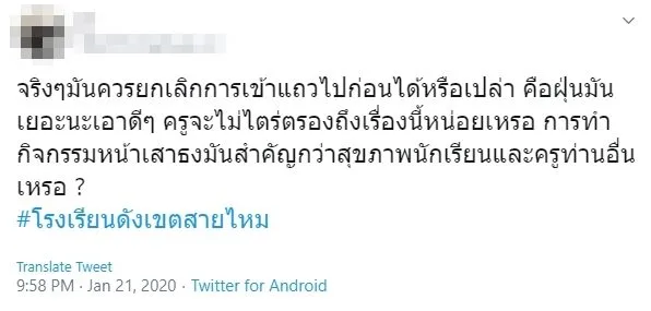 ซึ่งใจความเนื้อหาที่ถูกวิพากษ์วิจารณ์ผู้บริหารโรงเรียน ที่ปล่อยให้นักเรียนเข้าแถวในช่วงเช้า ทั้งที่พื้นที่เขตสายไหมมีปริมาณฝุ่น PM 2.5 ค่อนข้างเยอะ