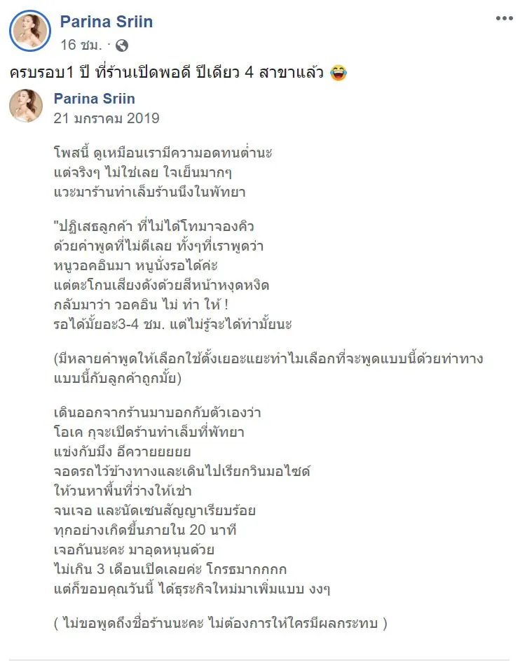 จากกรณีผู้ใช้เฟซบุ๊ค Parina Sriin หรือ โม-ปริณาห์ ศรีอินทร์ ได้โพสต์ เมื่อวันที่ 21 ม.ค 63 ที่ผ่านมา เล่าเรื่องราวที่ไม่น่าประทับใจ หลังจากที่เจ้าตัวได้เข้าไปใช้บริการร้านทำเล็บแห่งหนึ่งในเมืองพัทยา ถูกช่างร้านทำเล็บ แสดงพฤติกรรมไม่ดีใส่ เนื่องจากเธอเข้าไปที่ร้าน หวังที่จะทำเล็บ แต่กลับถูกช่วงตระโกนไล่ แถมบอกว่าไม่ทำให้ เพราะไม่ได้โทรมาจองคิวล่วงหน้า ทำให้เธอแค้นใจ จึงตัดสินใจเปิดร้านแข่งภายในเวลา 20 นาที