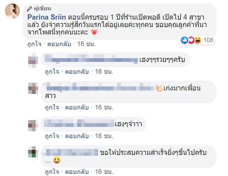 อย่างไรก็ตาม เมื่อวานที่ผ่านมา เป็นวันครบรอบที่ร้านเปิดพอดี ซึ่งเหตุการณ์ดังกล่าวที่เกิดขึ้น เจ้าตัวได้โพสต์อัพเดทว่าปัจจุบันนี้ร้านเล็บของเธฮนั้น เพียงแค่เวลา 1 ปี เปิดไปแล้วถึง 4 สาขา ทำเอาชาวเน็ตหลายคนเข้ามาแสดงความคิดเห็นเป็นจำนวนมาก พร้อมทั้งแสดงความยินดีกันอย่างล้นหลาม