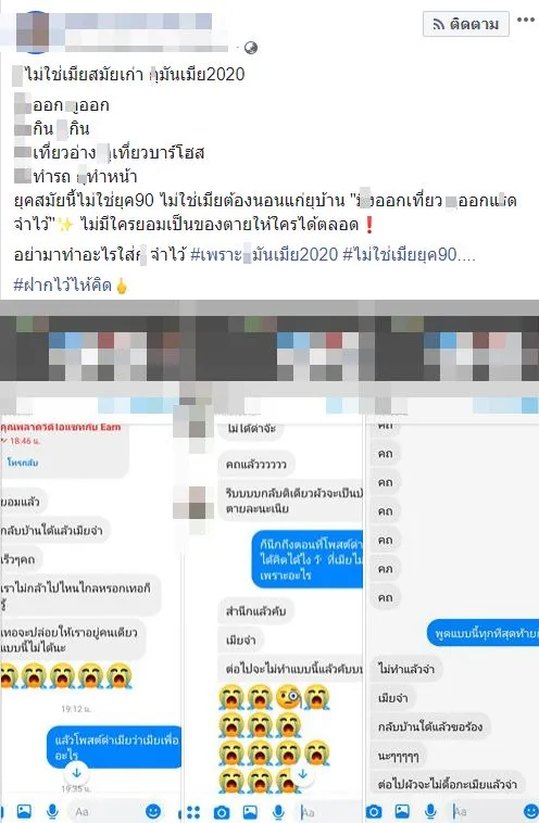 โดยผู้ใช้เฟซบุ๊กท่านนี้ยังโพสต์ว่ากูไม่ใช่เมียสมัยเก่าฉันมันเมีย2020 คุณออก ฉันออกคุณกิน ฉันกิน คุณเที่ยวอ่าง ฉันเที่ยวบาร์โฮสคุณทำรถ ฉันทำหน้ายุคสมัยนี้ไม่ใช่ยุค 90 ไม่ใช่เมียต้องนอนแก่อยู่บ้าน”คุณออกเที่ยว ฉันออกเที่ยวจำไว้ ไม่มีใครยอมเป็นของตายให้ใครได้ตลอดอย่ามาทำอะไรใส่ฉัน จำไว้ #เพราะฉันมันเมีย2020 #ไม่ใช่เมียยุค90….#ฝากไว้ไห้คิด