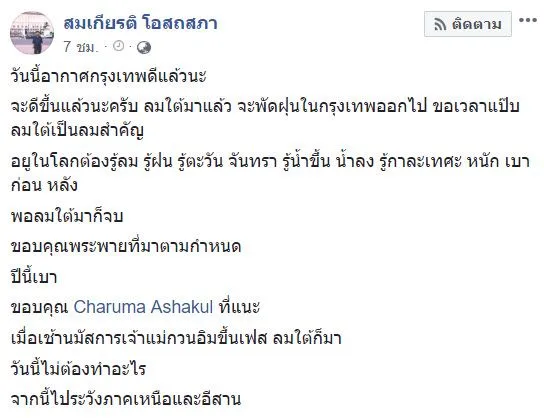 วันนี้อากาศกรุงเทพดีแล้วนะ จะดีขึ้นแล้วนะครับ ลมใต้มาแล้ว จะพัดฝุนในกรุงเทพออกไป ขอเวลาแป๊บ ลมใต้เป็นลมสำคัญ อยูในโลกต้องรู้ลม รู้ฝน รู้ตะวัน จันทรา รู้น้ำขึ้น น้ำลง รู้กาละเทศะ หนัก เบา ก่อน หลัง พอลมใต้มาก็จบ ขอบคุณพระพายที่มาตามกำหนด ปีนี้เบา ขอบคุณ Charuma Ashakul ที่แนะ เมื่อเช้านมัสการเจ้าแม่กวนอิมขึ้นเฟส ลมใต้ก็มา วันนี้ไม่ต้องทำอะไร จากนี้ไประวังภาคเหนือและอีสาน