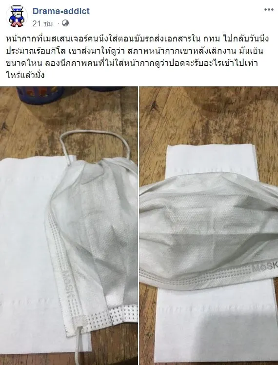 เพจเฟซบุ๊กโพสต์ข้อความระบุว่า “หน้ากากที่เมสเสนเจอร์คนนึงใส่ตอนขับรถส่งเอกสารใน กทม ไปกลับวันนึงประมาณร้อยกิโล เขาส่งมาให้ดูว่า สภาพหน้ากากเขาหลังเลิกงาน มันเยินขนาดไหน ลองนึกภาพคนที่ไม่ใส่หน้ากากดูว่าปอดจะรับอะไรเข้าไปเท่าไหร่แล้วมั่ง”