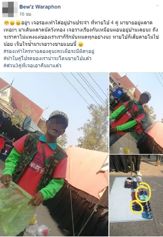 ผู้ใช้เฟซบุ๊กโพสต์ข้อความระบุว่า “อยู่ๆ เจอรองเท้าใส่อยู่บ้านประจำ ที่หายไป 4 คู่ มาขายอยู่ตลาด เหอะๆ มาเดินตลาดนัดวังทอง เจอวางเรียงกันเหมือนตอนอยู่บ้านเลยนะ ถึงจะราคาไม่แพงแต่ของเราเราก็รักมันหมดทุกอย่างนะ หายไปก็เสียดายไม่ใช่น้อย เจ็บใจซ้ำมาเจอวางขายแบบนี้ รองเท้าใครหายลองดูนะคะเผื่อจะมีติดๆอยู่ ผ้าใบคู่โปรดของเราน่าจะโดนขายไปแล้ว ส่วน3คู่ที่เจอเอาคืนมาแล้ว”