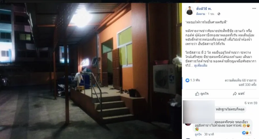 ขณะเดียวกัน นักข่าวชื่อดังได้โพสต์ลงในเฟซบุ๊ก สันติวิธี พ. ความว่า “ผมขอให้การในชั้นศาลครับพี่” หลังรายงานข่าวจับนายประสิทธิชัย เขาแก้ว หรือกอล์ฟ ผู้ต้องหาชิงทองมาตลอดทั้งวัน ผมเดินอ้อมหลังตึกตำรวจท่องเที่ยวลพบุรี เพื่อไปเข้าห้องน้ำ เพราะว่า อั้นปัสสาวะไว้ทั้งวัน