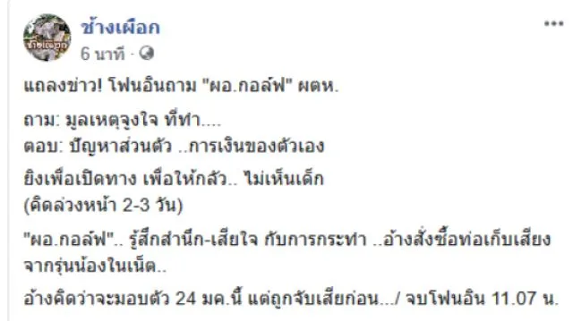 หลังจากที่ประชาชนให้ความสนใจเป็นอย่างมากสำหรับ ผอ.กอล์ฟ หรือนาย ประวิทธิชัย เขาแก้ว จบการศึกษาปริญญาโท วิชาเอก กศ ม บริหารการศึกษา จากมหาลัยชื่อดังแห่งหนึ่ง และเมื่อสำรวจย้อนไทม์ไลน์ ในเฟซบุ๊กของผู้ต้องหาไป พบคลิปเมื่อปี 2560 จะเห็นลักษณะการเดินของ ผอ ค่อนข้างชัดเจน ว่า ขาซ้ายเดินกะเผลก ล่าสุด วันนี้ เพจ ช้างเผือก ได้โพสต์ข้อความระบุว่า แถลงข่าว โฟนอินถาม ผอ.กอล์ฟ ผตห. ถาม มูลเหตุจูงใจ ที่ทำ ตอบ ปัญหาส่วนตัว การเงินของตัวเอง (คิดล่วงหน้า 2ถึง3 วัน) ผอ.กอล์ฟ รู้สึกสำนึก เสียใจ กับการกระทำ อ้างสั่งซื้อท่อเก็บเสียงจากรุ่นน้องในเน็ต อ้างคิดว่าจะมอบตัว 24 มค นี้ แต่ถูกจับเสียก่อน จบโฟนอิน 11จุด 07 น