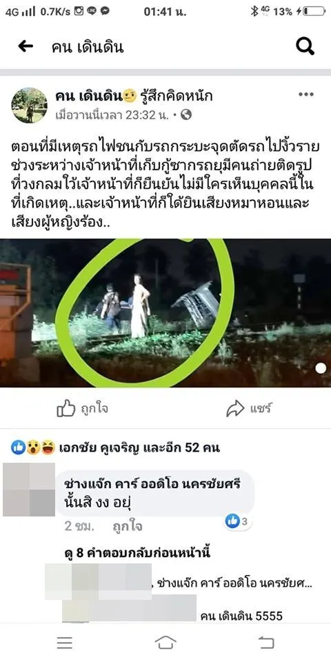 กู้ภัยถึงกับหลอน เข้าช่วยเหตุรถไฟชนกระบะแยกงิ้วราย ถ่ายภาพติดบุคคลปริศนาใส่ชุดนางรำ