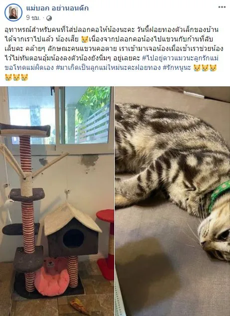 กลายเป็นเรื่องราวสุดสะเทือนใจสำหรับคนรักแมว เมื่อผู้ใช้เฟซบุ๊ค แม่บอก อย่านอนดึก ได้โพสต์เตือนภัยอุทาหรณ์ใกล้ตัวระหว่างแมวกับปลอกคอสุดน่ารัก ซึ่งก่อนหน้านี้เจ้าของได้ซื้อคอนโดให้กับแมว ลักษณะเป็นบ้านทรงสูงมีที่นอนเป็นชั้นๆ พร้อมทั้งของเล่นและที่ลับเล็บ ก่อนจะเกิดเหตุสลดใจขึ้น ปลอกคอไปเกี่ยวกับที่ลับเล็บ ทำให้เจ้าแมวเหมือนแขวนคอกลางอากาศจนสิ้นลมหายใจ