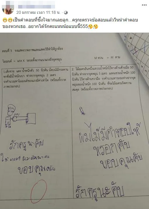 โดยนักเรียนชายรายนี้เขียนคำตอบในวิชาวิทยาศาสตร์เป็นลูกอ้อนแบบสุดๆและกล่าวว่า ตนนั้นรักครูมากให้เกรด 4 เค้าด้วย ส่วนโจทย์ปัญหานั้นไม่มีคำตอบให้ พร้อมขอบคุณคุณครูท่านนี้ ซึ่งหลังจากโพสต์นี้ถูกเผยแพร่ออกไปได้มีชาวเน็ตจำนวนมากเข้ามาแสดงความคิดเห็นและกล่าวว่าอย่างเห็นหน้าศิษย์รายนี้เหลือเกิน
