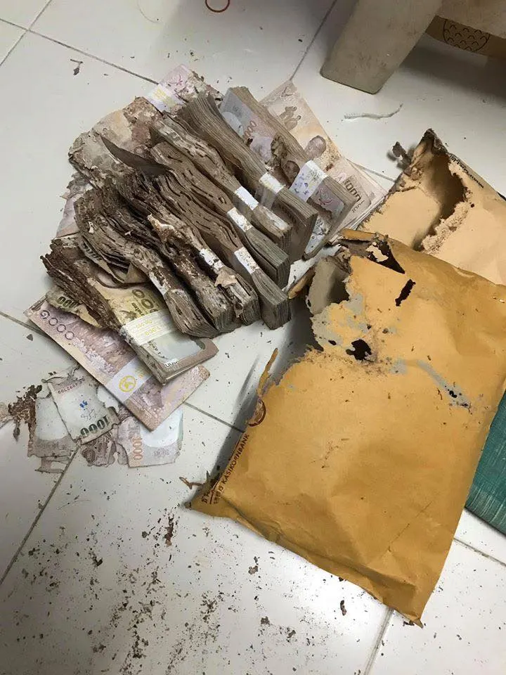 โดยเพจดังอย่าง Red Skull Society ได้โพสต์ภาพพร้อมระบุข้อความว่า เศร้าเลยครับเงินเก็บมาตั้งนานไว้ใช้ยามฉุกเฉิน พูดไรไม่ออกเลย เรื่องเล่าจากทางบ้าน โดยหลังจากที่โพสต์ดังกล่าวเผยแพร่ออกไปก็มีคนเข้ามาแสดงความคิดเห้นอาทิเช่น งงที่ไม่ฝากธนาคาร หรือเอาไปซื้อทองมาเก็บนี่ละ , แลกคืนได้นะคะลองไปธนาคารดู , งงทำไมเก็บไว้แบบนี้ คนเก็บแบบนี้ดูแปลกๆมั้ย , นั่นแหละที่กลัว พอได้มาต้องรีบใช้ให้หมด กลัวปลวกขึ้น