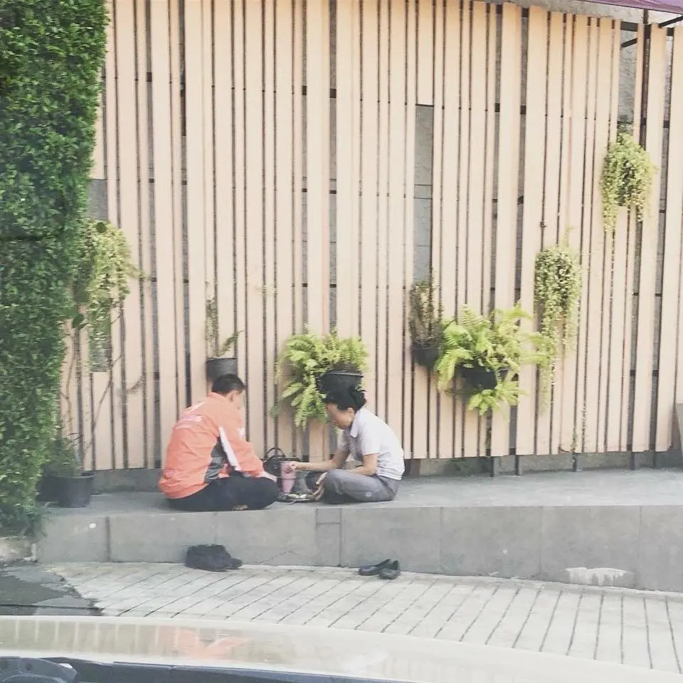 รูปนี้ถ่ายตอนประมาณบ่ายโมง ดูจากชุดแล้วเดาว่าพี่ผู้ชายวิ่งรถส่งของ พี่ผู้หญิงน่าจะเป็นพนง.ห้าง ถึงแม้จะทำงานคนละที่ คนละอย่างกัน แต่ก็ยังหาเวลามากินข้าวด้วยกัน ไม่จำเป็นต้องนั่งร้านหรูกินของแพง นั่งหน้าห้างนี่แหละ ถอดรองเท้าด้วย