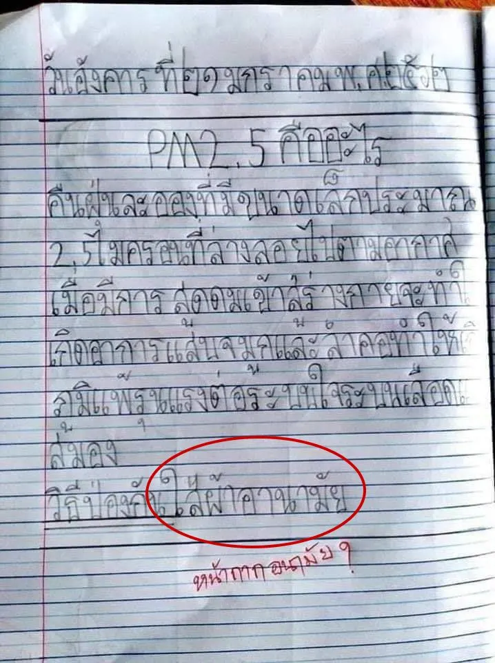 เด็กนักเรียนเขียนอธิบาย ฝุ่น PM 2.5 คืออะไร ระบุว่า “คือฝุ่นละอองที่มีขนาดเล็กประมาณ 2.5 ไมครอนที่ล่วงลอยไปตามอากาศ เมื่อมีการสูดดมเข้าสู่ร่างกายจะทำให้เกิดอาการแสบจมูกและลำคอทำให้เกิดภูมิแพ้รุนแรงต่อระบบใจระบบเลือดและสมอง”
