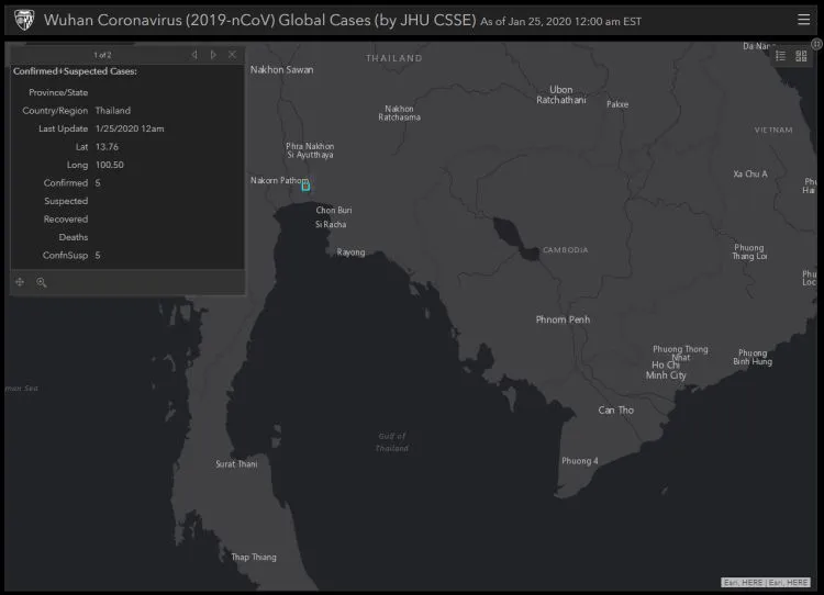 ล่าสุด นักวิจัยจากมหาวิทยาลัย จอห์น ฮอปกินส์ ได้รวบรวบข้อมูลต้นทาง จากองค์การอนามัยโลก (WHO) เกี่ยวกับการระบาดของเชื้อไวรัส โคโรนา หรือ ไวรัสอู่ฮั่น แล้วแสดงผลข้อมูลแบบเข้าใจได้ง่าย เผยแพร่ทางหน้าเว็บไซต์ gisanddata.maps.arcgis.com ที่จะบอกข้อมูลทั้งจำนวนผู้ติดเชื้อ, ผู้เสียชีวิต และมีแยกจำนวนตามเมืองและประเทศที่ตัวพบ ซึ่งข้อมูลจะมีการอัปเดตอย่างเรียลไทม์
