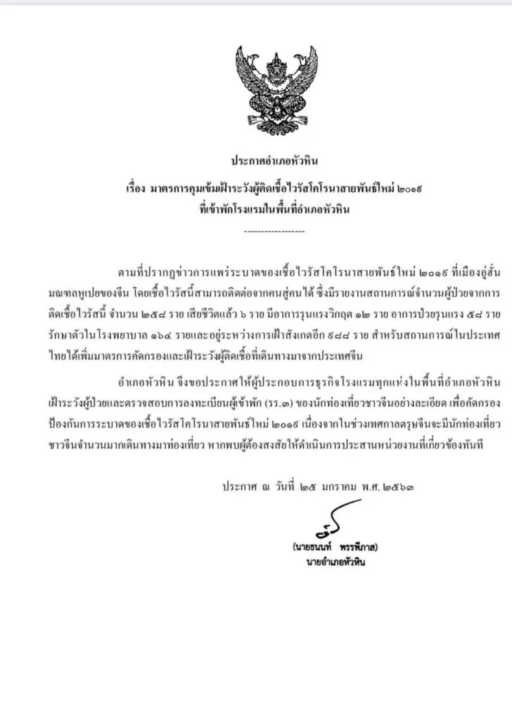 ล่าสุดมีประกาศจากอำเภอหัวหิน เรื่องมาตรการคุมเข้มเฝ้าระวังผู้ติดเชื้อไวรัสโคโรนาสายพันธุ์ใหม่2019ที่เข้าพักโรงแรมในพื้นที่อำเภอหัวหิน ประกาศแจ้งให้ผู้ประกอบการธุรกิจโรงแรมทุกแห่งในพื้นที่ เฝ้าระวังผู้ป่วยและตรวจสอบการลงทะเบียนผู้เข้าพักหรือแบบ รร.3 ของนักท่องเที่ยวชาวจีนอย่างละเอียด เพื่อคัดกรองการป้องกันโรคระบาดของเชื้อไวรัสโคโรน่าสานพันธ์ใหญ่ 2019