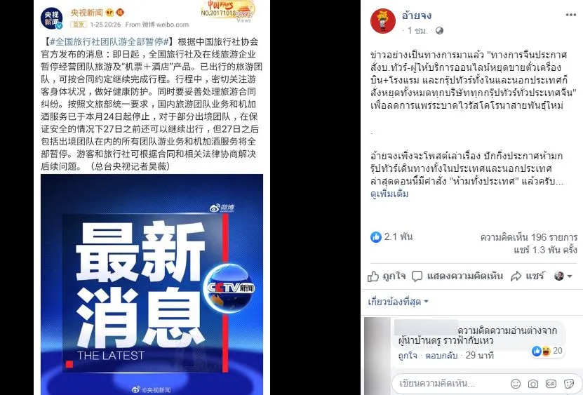 ล่าสุดเพจ อ้ายจง ได้อัพเดตสถานการณ์ว่า “ข่าวอย่างเป็นทางการมาแล้ว “ทางการจีนประกาศสั่งบ.ทัวร์-ผู้ให้บริการออนไลน์หยุดขายตั๋วเครื่องบิน+โรงแรม และกรุ๊ปทัวร์ทั้งในและนอกประเทศก็สั่งหยุดทั้งหมดทุกบริษัททุกกรุ๊ปทัวร์ทั่วประเทศจีน” เพื่อลดการแพร่ระบาดไวรัสโคโรน่าสายพันธุ์ใหม่