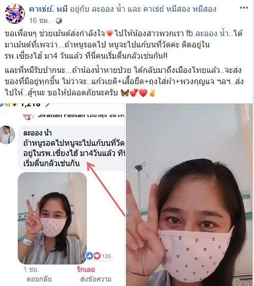 นอกจากนี้เพจดังกล่าวยังได้ให้รายละเอียดอีกว่า “นี่หมีก็พึ่งแชทให้กำลังใจน้องน้ำ fb.ละออง น้ำ ..ตอนนี้น้องอยู่ที่ รพ.เซี้ยงไฮ้ ..น้องป่วยมีไข้ +มีโรคประจำตัว..อีกทั้งโดนกักกันตัว เพื่อตรวจสอบด้วยครับ (น้องไม่มีญาติ)”