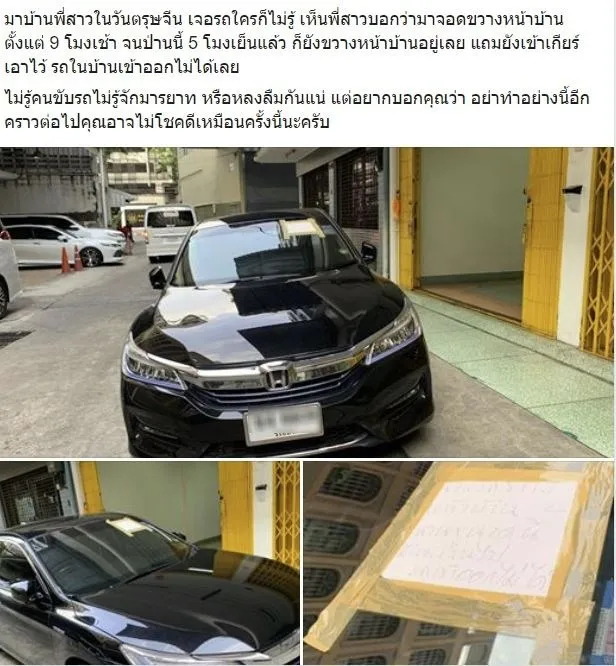 มาบ้านพี่สาวในวันตรุษจีน เจอรถใครก็ไม่รู้ เห็นพี่สาวบอกว่ามาจอดขวางหน้าบ้านตั้งแต่ 9 โมงเช้า จนป่านนี้ 5 โมงเย็นแล้ว ก็ยังขวางหน้าบ้านอยู่เลย แถมยังเข้าเกียร์เอาไว้ รถในบ้านเข้าออกไม่ได้เลย