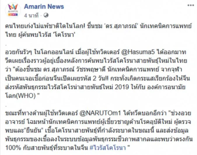 วันที่ 26 มกราคม 63 เพจเฟสบุ๊ค Amarin News ได้โพสต์ข้อความระบุว่า “คนไทยเก่งไม่แพ้ชาติใดในโลก ชื่นชม ดร สุภาภรณ์ นักเทคนิคการแพทย์ไทย ผู้ค้นพบไวรัส โคโรนา”