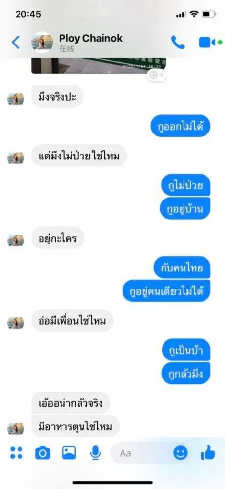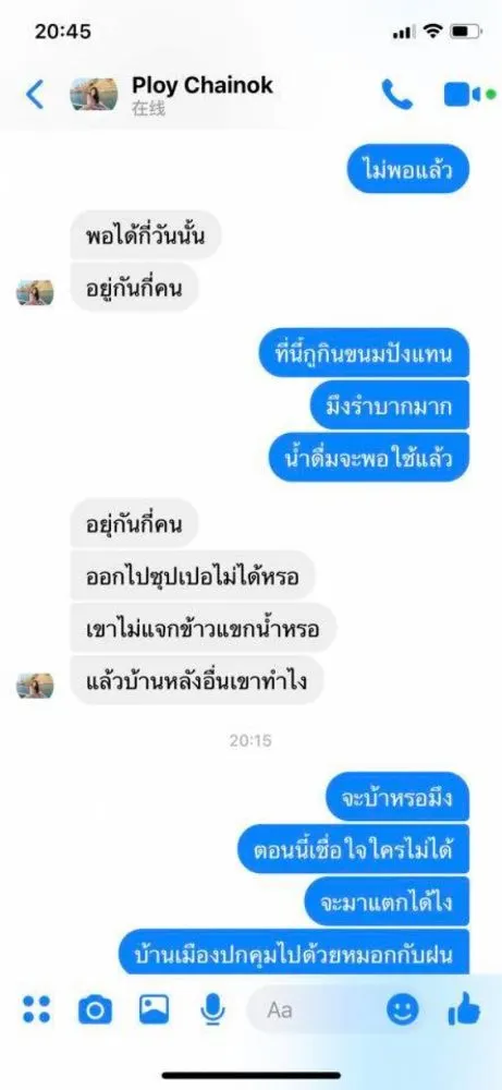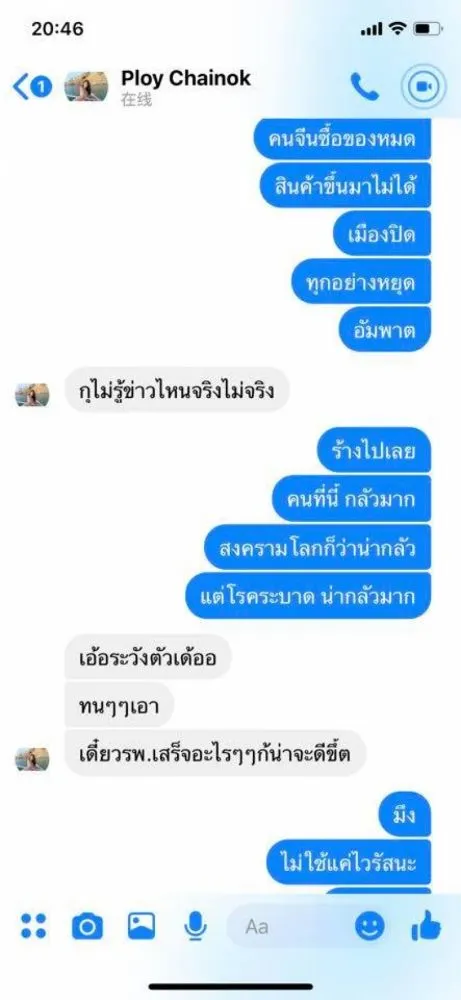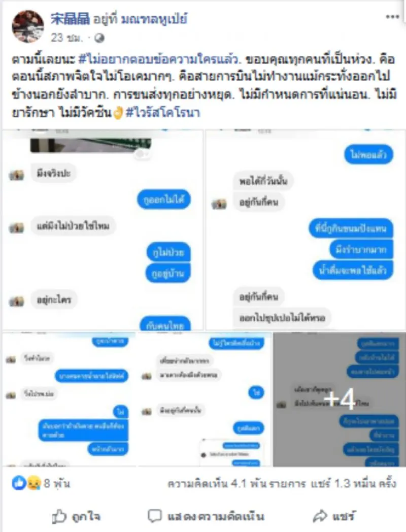 จากสถานการณ์ ที่ประเทศจีน ผู้ใช้เฟซบุ๊ครายหนึ่งเป็นสาวไทยในมณฑลหูเป่ย์ โพสต์ภาพบทสนทนาที่คุยกันกับเพื่อน ที่แชทเข้ามาสอบถามถึงสถานการณ์ที่เกิดขึ้น โดยเธอได้เล่าถึงสิ่งที่ต้องเผชิญเมื่อมีคำสั่งปิดเมืองว่า ต่างคนต่างอยู่ ต้องกักตุนอาหารกันเอง