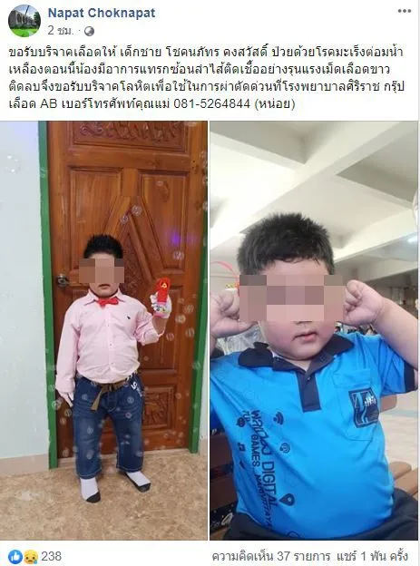 บนเฟซบุ๊ก Napat Choknapat ได้โพสต์ขอรับบริจาคเลือดให้กับเด็กชายคนหนึ่งที่ป่วยด้วยโรคมะเร็งต่อมน้ำเหลืองแล้วเกิดภาวะแทรกซ้อนต้องเข้ารับการผ่าตัดอย่างเร่งด่วน