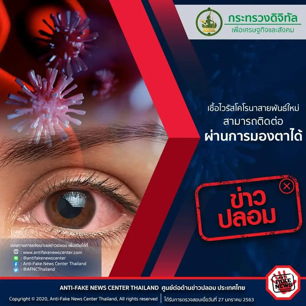 กรมควบคุมโรค ยืนยันเชื้อไวรัสโคโรนาสายพันธุ์ใหม่ ไม่สามารถติดต่อผ่านการมองตา แต่การจะติดเชื้อนั้นเกิดจากเมื่อผู้ติดเชื้อมีการไอหรือจาม แล้วมีละอองออกมาข้างนอก หากเรามีการไปสัมผัสก็มีโอกาสได้รับเชื้อ