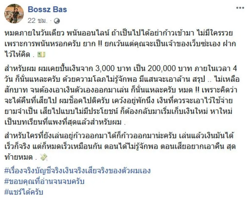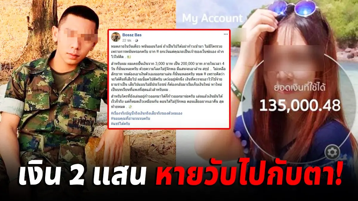 หนุ่มโพสต์ มีเงิน 3000 สู่เงิน 2 แสน แต่ไม่รู้จักพอสุดท้ายหมดตัว