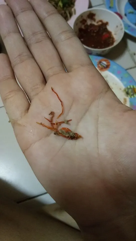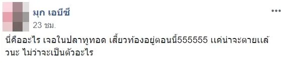ผู้ใช้เฟซบุ๊กโพสต์ข้อความระบุว่า “นี่คืออะไร เจอในปลาทูทอด เสียวท้องอยู่ตอนนี้ 555555 เเต่น่าจะตายเเล้วนะ ไม่ว่าจะเป็นตัวอะไร”