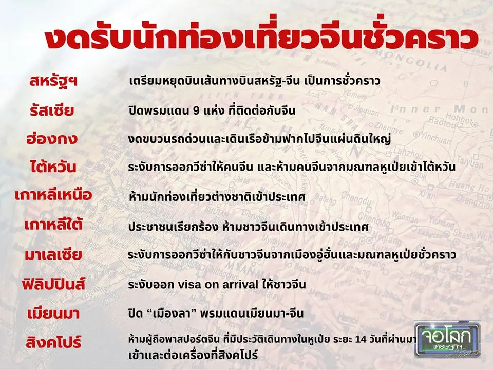 เฟซบุ๊กแฟนเพจจอโลกเศรษฐกิจ เปิดรายชื่อ 10 ประเทศ ที่งดรับนักท่องเที่ยวชาวจีนชั่วคราว หลังเกิดโรคระบาดจากไวรัสโคโรน่า 2013