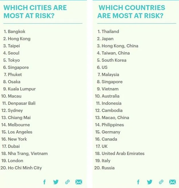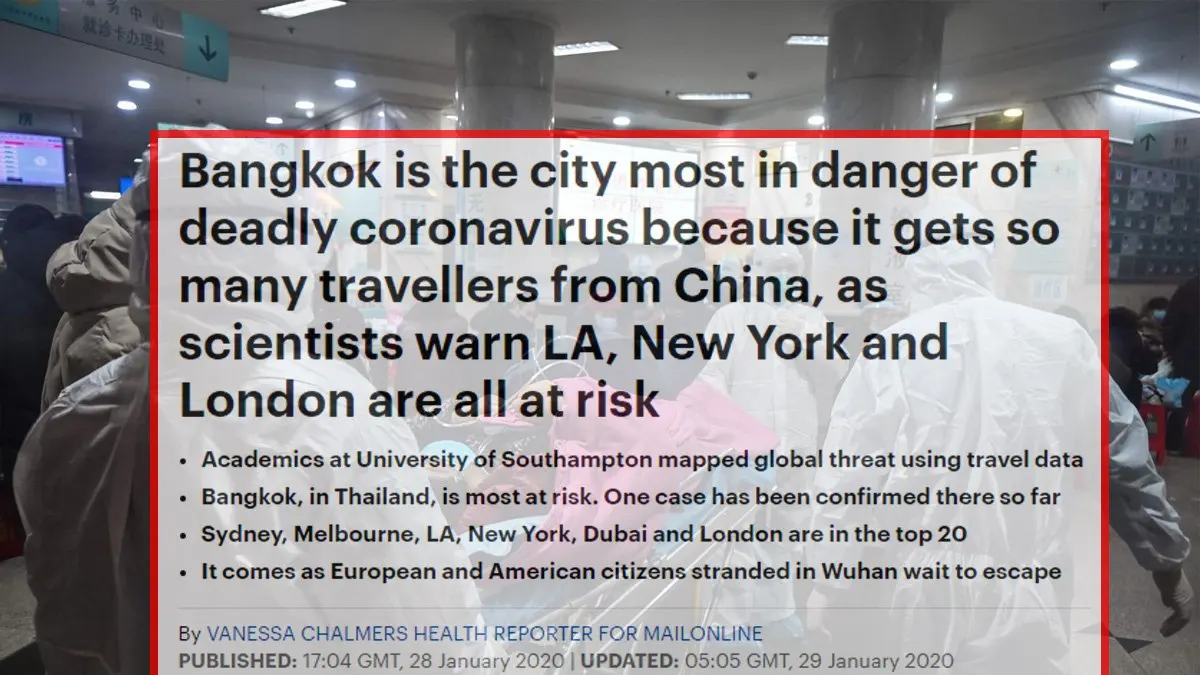 กรุงเทพ เมืองหลวงของประเทศไทย เป็นเมืองที่ตกอยู่ในความเสี่ยงมากที่สุด จากสถิติจำนวนเที่ยวบินที่บินออกจากเมืองอู่ฮั่น ประเทศจีน ตามมาด้วย ฮ่องกง ไทเป โซล โตเกียว สิงคโปร์ ภูเก็ต โอซาก้า กัวลาลัมเปอร์ และมาเก๊า ตามลำดับ ขณะที่ เชียงใหม่ เป็นเมืองที่ตกอยู่ในความเสี่ยง อันดับที่ 13