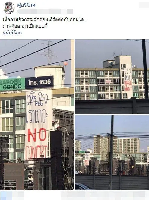 เหมือนอย่างเหตุการณ์ที่ทางเพจ ผู้บริโภค ได้นำมาเสนอ ซึ่งเหล่าผู้อาศัยในคอนโดแห่งหนึ่งได้ทำป้ายออกมาอย่างชัดเจนว่าไม่พอใจกรณีที่บริเวณใกล้ ๆ มักจะมีการจัดคอนเสิร์ตอยู่เสมอ โดยทางเพจได้ให้ข้อมูลว่า