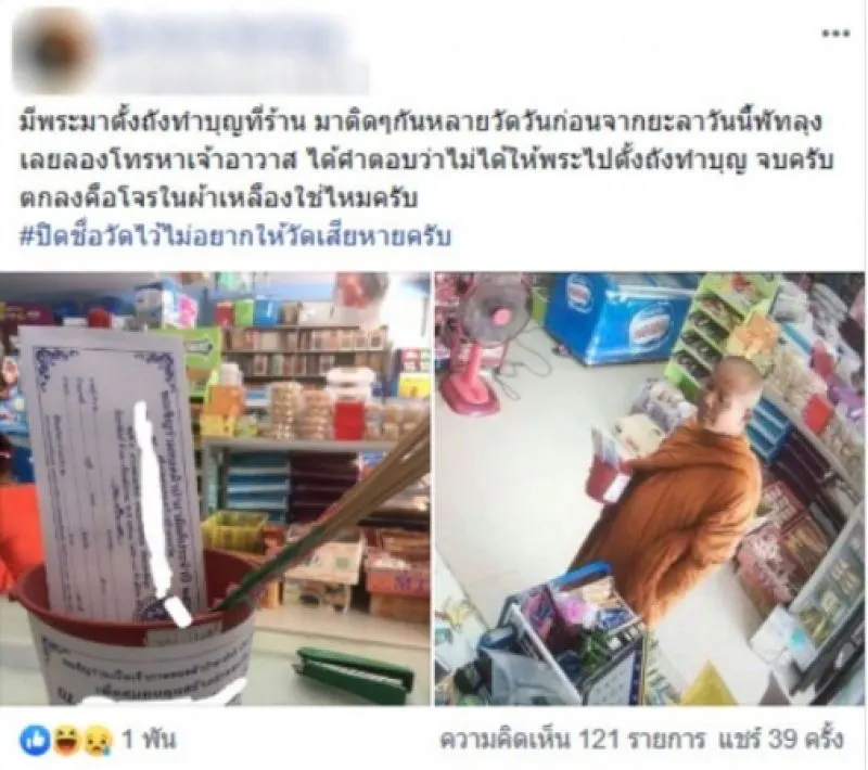 ผู้โพสต์ระบุข้ความว่า มีพระมาตั้งถังทำบุญที่ร้าน มาติดๆกันหลายวัดวันก่อนจากยะลาวันนี้พัทลุง เลยลองโทรหาเจ้าอาว่า ได้คำตอบว่าไม่ได้ให้พระไปตั้งถังทำบุญ จบครับ ตกลงคือโจรในคราบผ้าเหลืองใช่ไหมครับ