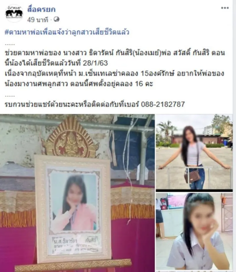 วันที่ 30 มกราคม 2563 ผู้สื่อข่าวสยามนิวส์รายงานว่า โลกออนไลน์มีการแชร์ภาพเรื่องราวของผู้ใช้เพจเฟซบุ๊กชื่อ สื่อครยก ที่ได้โพสต์ภาพของสาวสวยรายหนึ่งพร้อมระบุข้อความว่า ตามหาพ่อเพื่อแจ้งว่าลูกสาวเสียชีวิตแล้ว ช่วยตามหาพ่อของ นางสาว ธิดารัตน์ กันสิริ น้องเมย์ พ่อ สวัสดิ์ กันสิริ ตอนนี้น้องได้เสียชีวิตแล้ววันที่ 28 1 63 เนื่องจากอุบัตเหตุที่หน้า ม.เซ็นเทเลซ่าคลอง 15องค์รักษ์ อยากให้พ่อของน้องมางานศพลูกสาว ตอนนี้ศพตั้งอยู่คลอง 16 คะ รบกวนช่วยแชร์ด้วยนะคะหรือติดต่อกับที่เบอร์ 0882182787