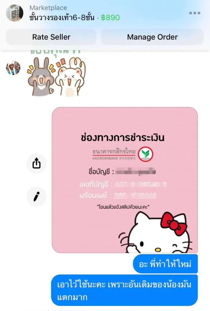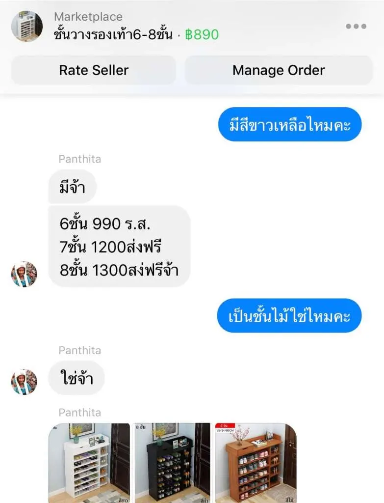 เรื่องมีอยู่ว่า เมอยากได้ชั้นวางรองเท้า เลยเลื่อนๆดูในเฟส พอเห็นตัวที่สนใจก็เลยทักไปหาแม่ค้าโดยที่ไม่ได้เช็คเฟสแม่ค้าเลยจนตัดสินใจจะซื้อ เลยเข้าไปดูความน่าเชื่อถือของแม่ค้า