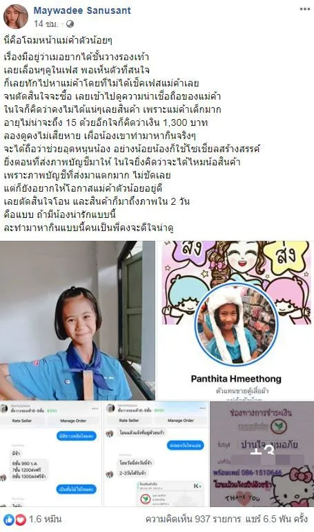 ในใจก็คิดว่าคงไม่ได้แน่ๆเลยสินค้า เพราะแม่ค้าเด็กมากอายุไม่น่าจะถึง 15 ด้วยอีกใจก็คิดว่าเงิน 1,300 บาท ลองดูคงไม่เสียหาย เผื่อน้องเขาทำมาหากินจริงๆจะได้ถือว่าช่วยอุดหนุนน้อง อย่างน้อยน้องก็ใช้โซเชียลสร้างสรรค์