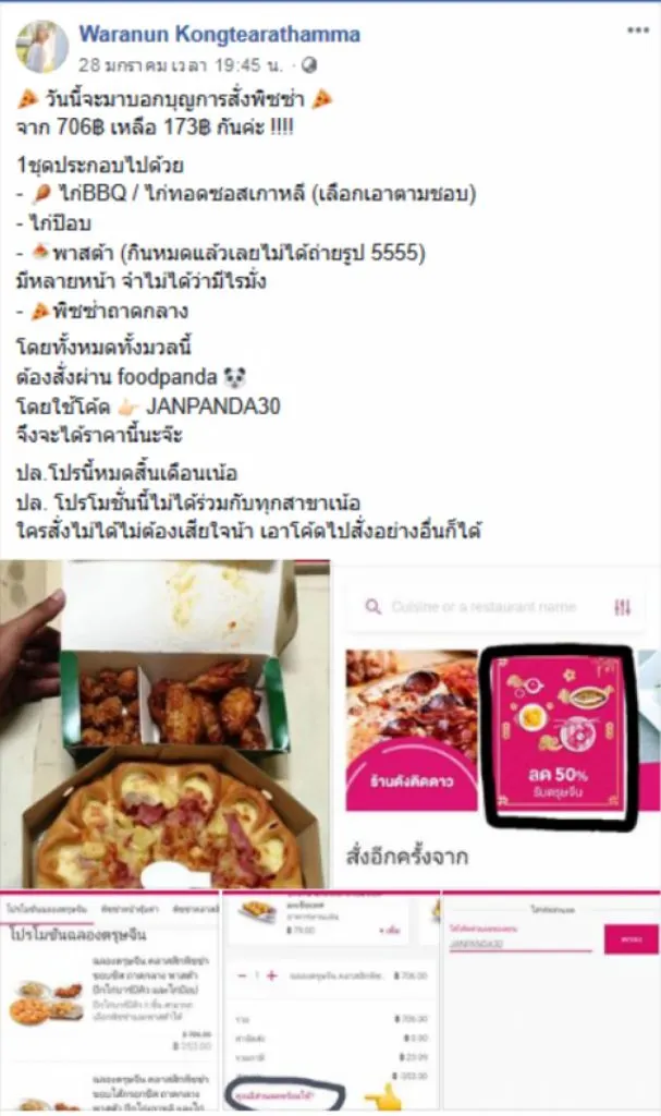 โดย ผู้ใช้เฟซบุ๊ค Waranun Kongtearathamma ได้รีวิว การสั่งพิซซ่าผ่านทางแอป ฟู้ดแพนด้า ซึ่งได้กรอกโค้ชส่วนลด ต้องบอกเลยว่า ลดอย่างมากเลยทีเดียว จาก 706 บาทเหลือแค่ 173 เท่า