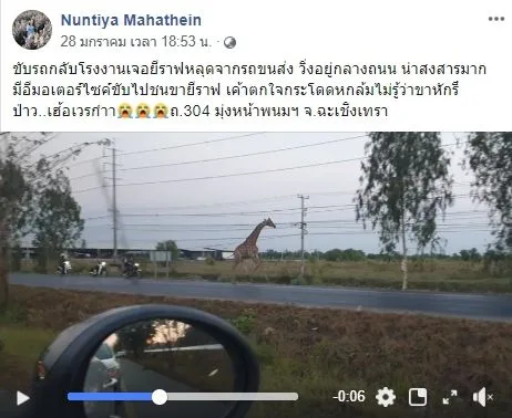 โดยเมื่อวันที่ 28 ม.ค. 63 ในโลกโซเชียลได้มีการเผยแพร่คลิปวิดีโอ พร้อมทั้งระบุข้อความเอาไว้ว่า…ขับรถกลับโรงงานเจอยีราฟหลุดจากรถขนส่ง วิ่งอยู่กลางถนน น่าสงสารมาก มีอีมอเตอร์ไซค์ขับไปชนขายีราฟ เขาตกใจกระโดดหกล้มไม่รู้ว่าขาหักรึป่าว..เฮ้อเวรกรรม ถ.304 มุ่งหน้าพนมฯ จ.ฉะเชิงเทรา